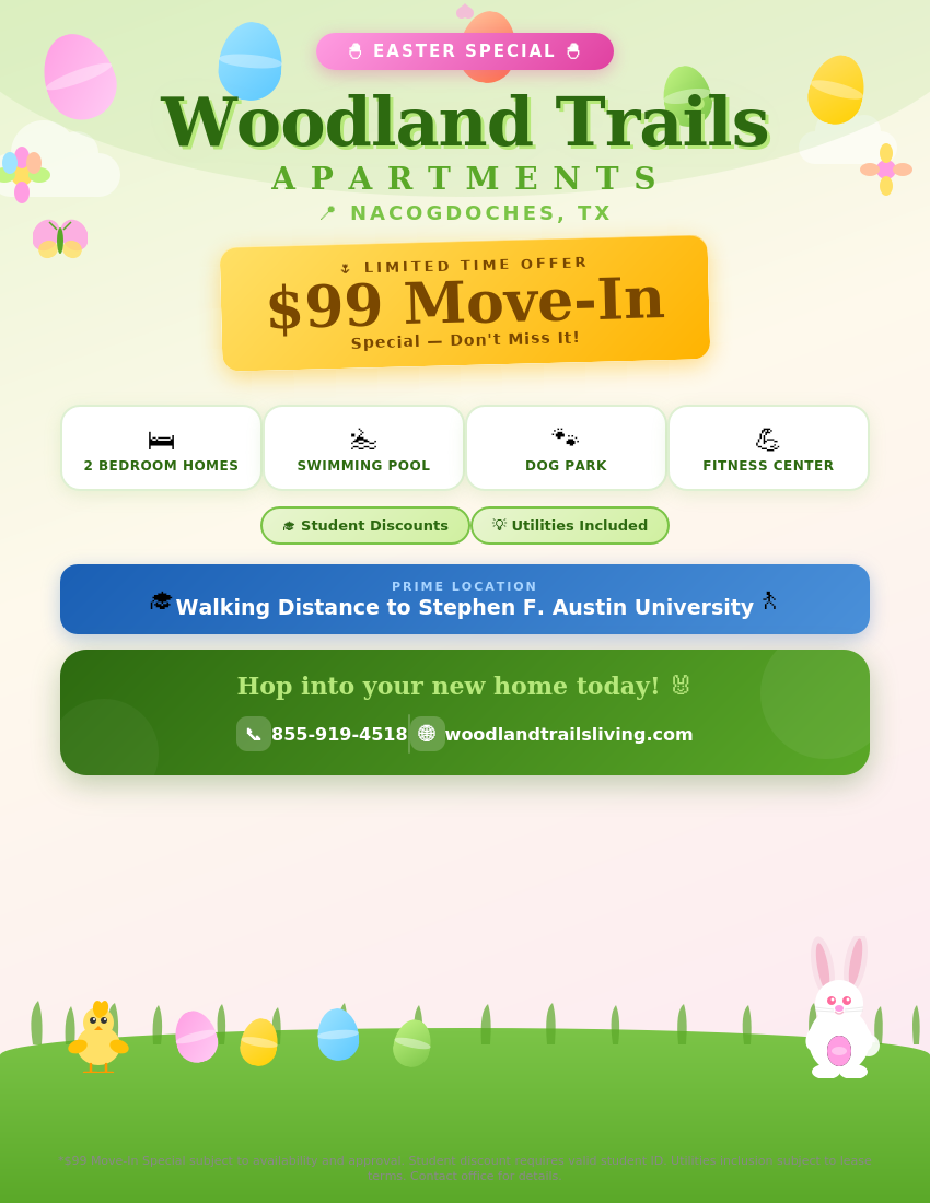Looking for off-campus housing in Nacogdoches Texas? Welcome to Woodland Trails apartments, where you're just two miles away from Stephen F. Austin University, and minutes from downtown, and major highways like 21, 59, and 224. Enjoy easy access to SFA, Nacogdoches Memorial Hospital, downtown restaurants, and local employers.